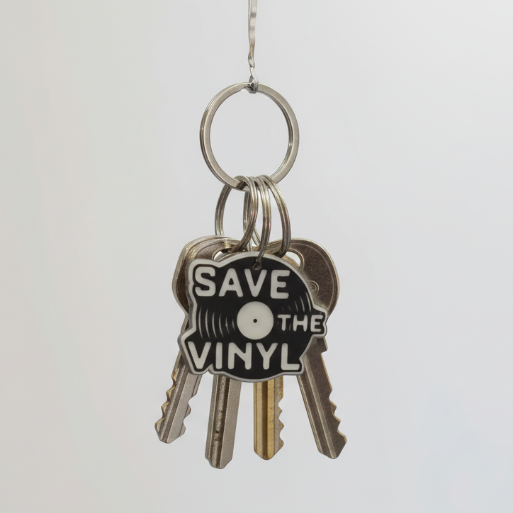 Sleutelhangers voor een feest met de naam Save the Vinyl.